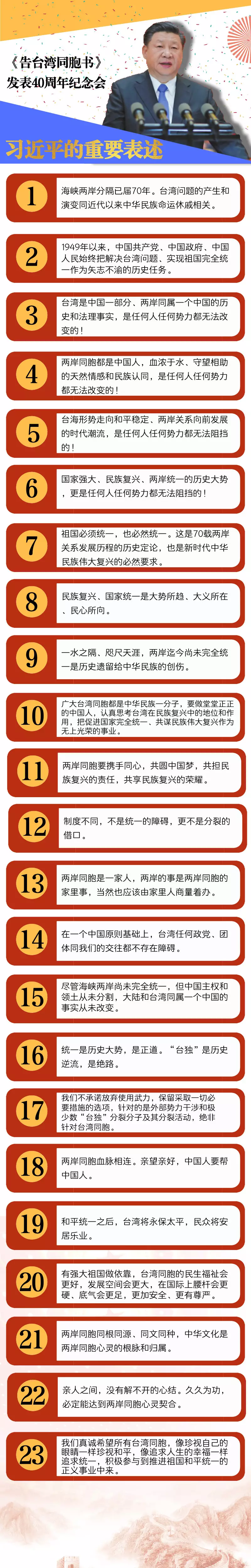 人民日报客户端1月2日消息,《告台湾同胞书》发表40周年纪念会1月2日上午举行。中共中央总书记、国家主席、中央军委主席习近平出席纪念会并发表重要讲话。