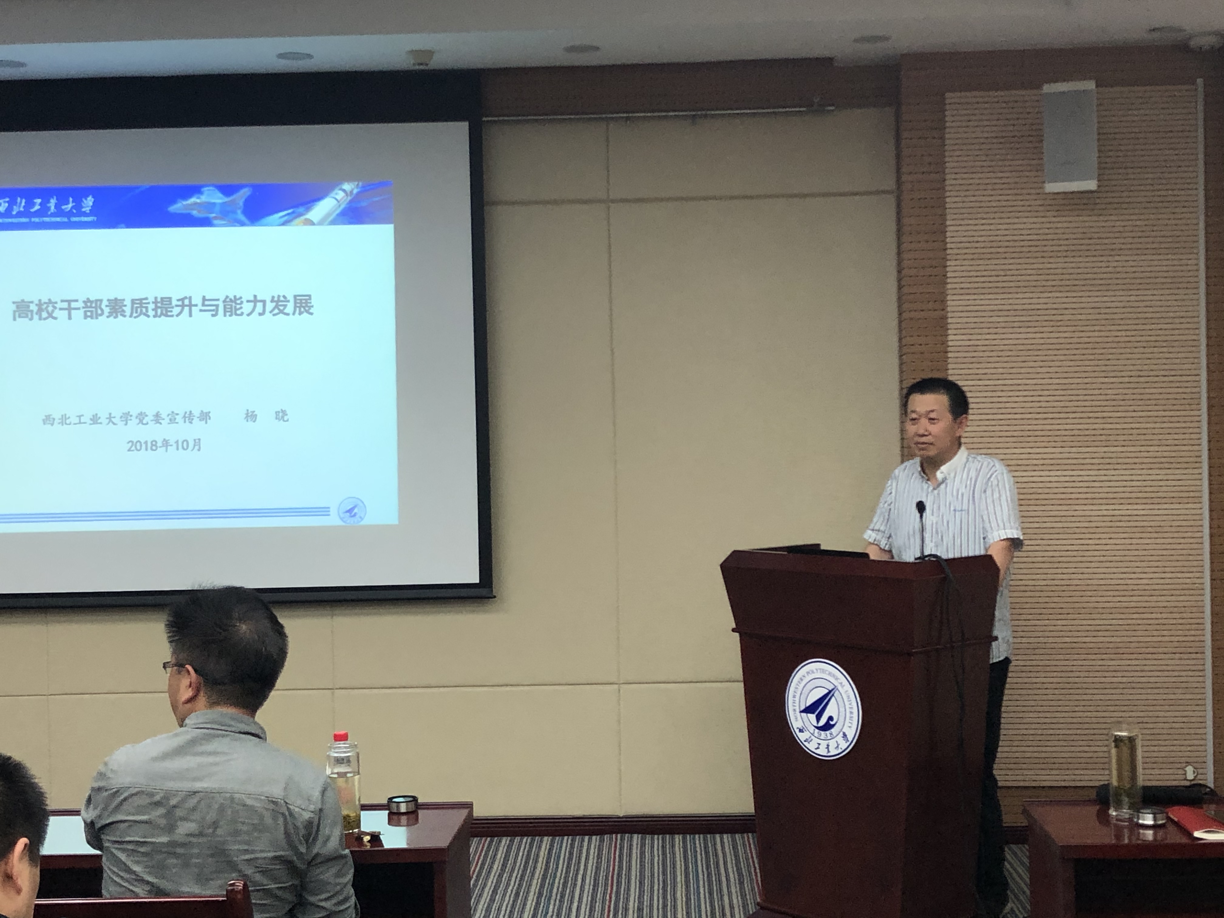西工大新闻网6月15日电(兰志峰)6月12日下午,“翱翔处级干部培训班”邀请学校党委常委、党委宣传部部长杨晓作题为《高校干部素质提升与能力发展》的专题讲座,讲座由机关党委书记李小聪主持。