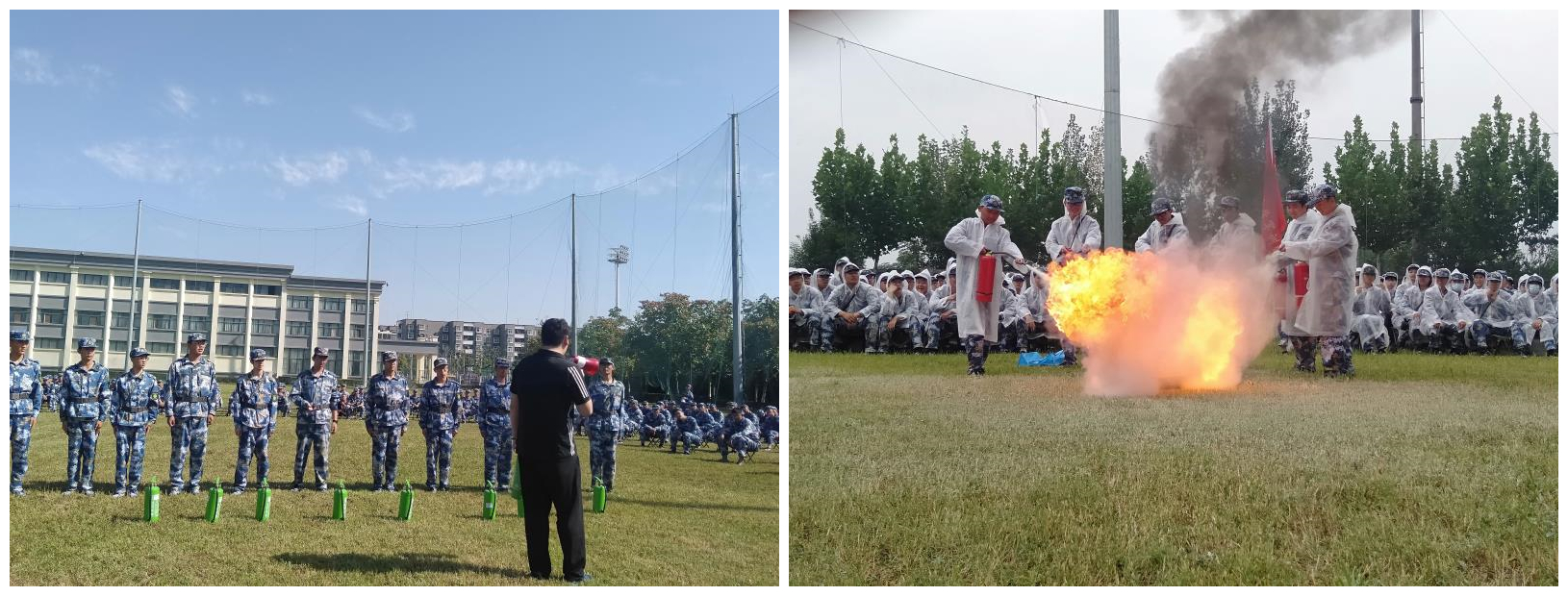 除此之外,我校保卫处对学生们的安全教育问题一直十分重视,在新生军训之余给新生培训消防自救的技能。连续三天,消防科徐磊、彭渤等人在不同军训连队之间给学生们讲解遇到火情时的处置方法、逃生与自救技能、灭火器使用方法等。