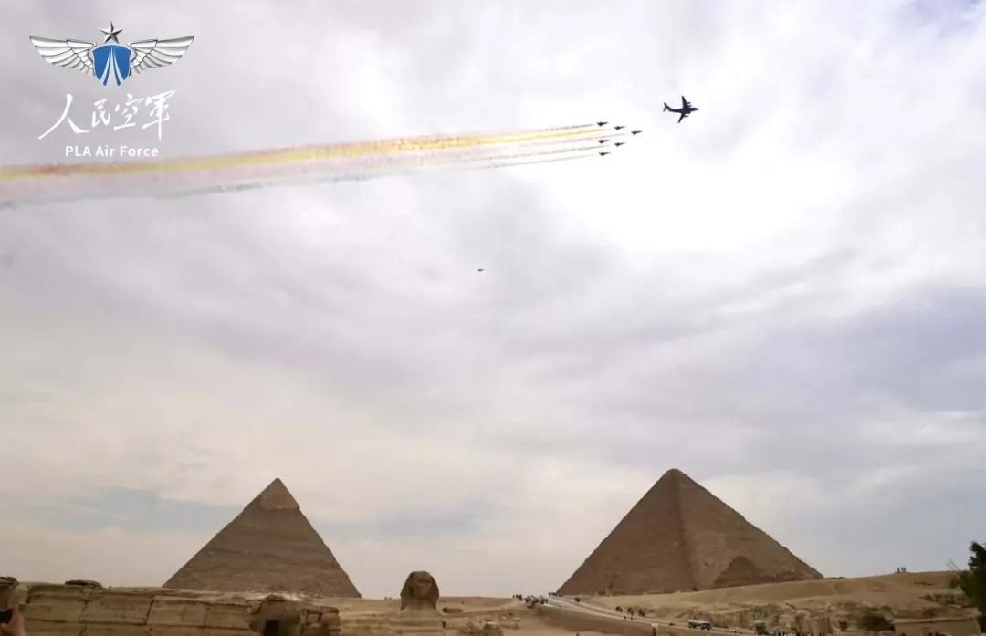 2024年8月28日,受邀参加首届埃及航展的中国空军1架运-20与八一飞行表演队6架歼-10表演机,编队飞越金字塔,在空中拉出象征中埃两国国旗颜色的六道彩烟。