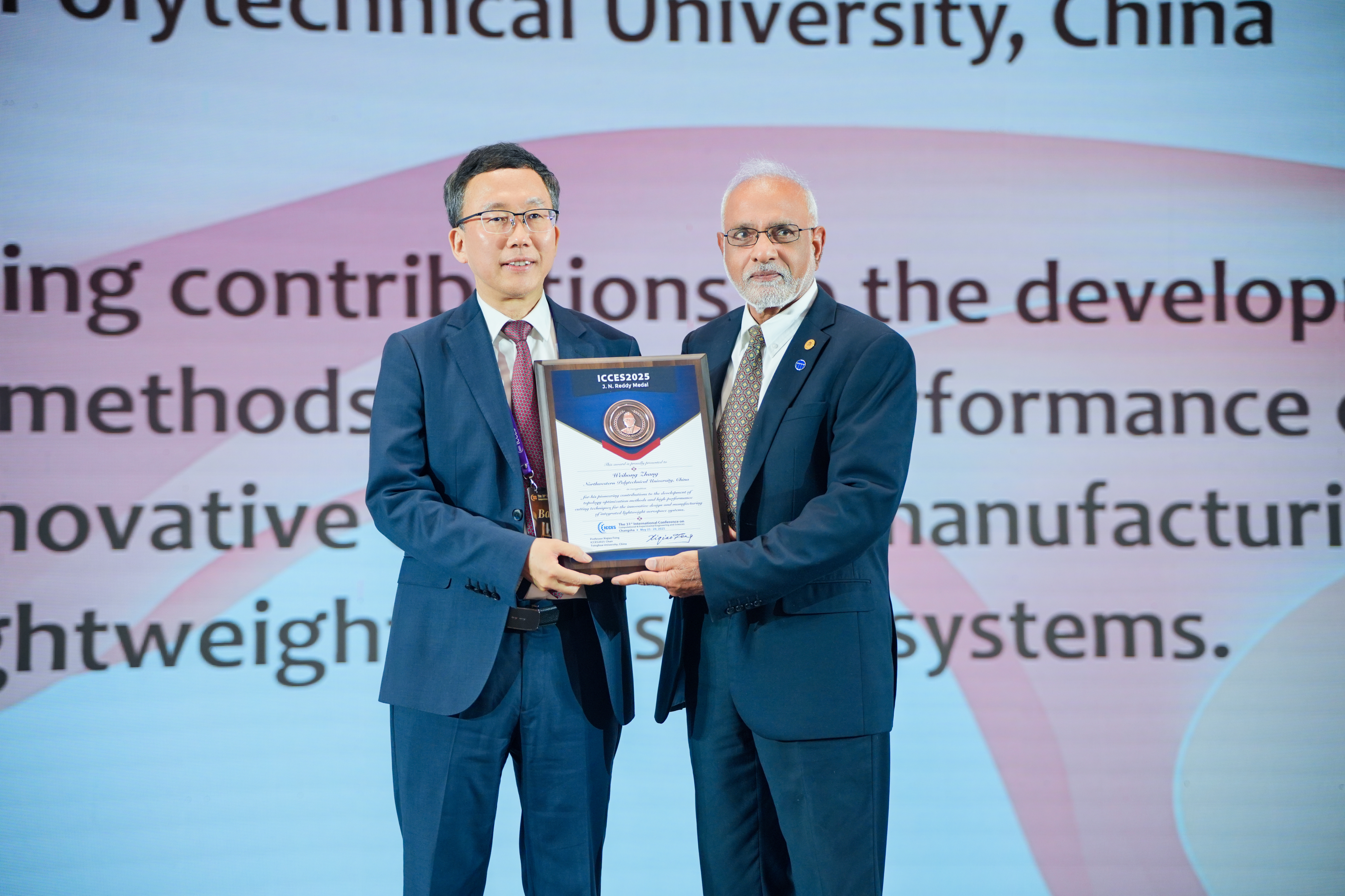 近日,在长沙举办的第三十一届计算与实验科学工程国际会议(ICCES 2025)上,我校张卫红院士荣获在力学领域享有盛誉的J. N. Reddy奖章,以表彰他在航空航天结构系统拓扑优化方法与高性能切削技术所作出的开创性贡献。