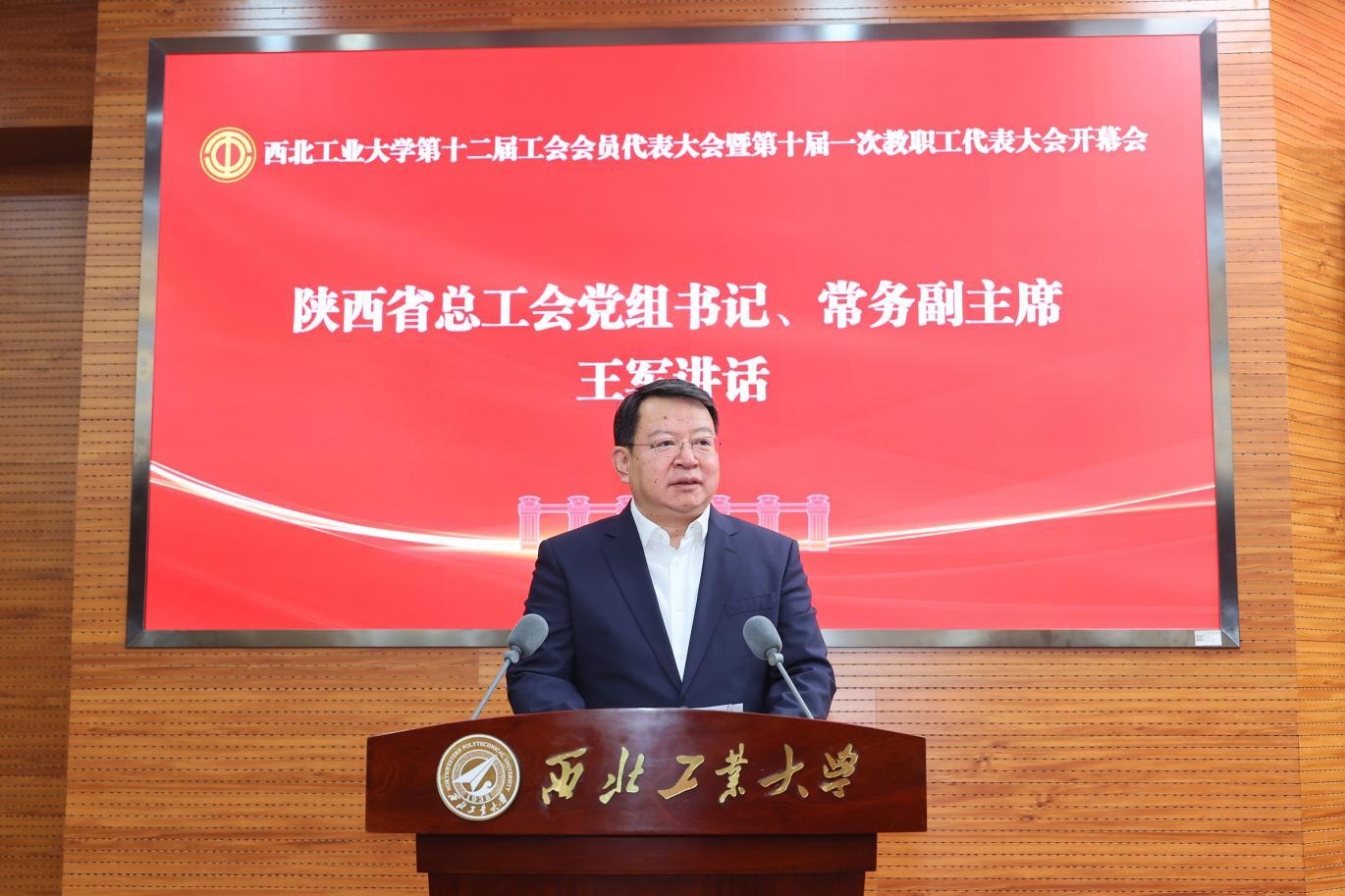 在当天上午的开幕会上,王军代表陕西省总工会对本次大会的召开表示祝贺。他说,西北工业大学作为一所以航空、航天、航海等领域人才培养和科学研究为发展特色的国家双一流建设高校,扎根西部、献身国防,为党育英才、为国铸重剑,为党和国家事业发展作出了重要贡献。他表示,近年来,西工大工会在加强思想政治引领、推进民主管理、丰富校园文化、促进和谐校园建设等方面做了大量卓有成效的工作,在全省教科文卫体系走在前列,起着重要的标杆示范作用。希望西工大工会在学校党委的领导下,把服务学校发展大局和服务教职工统一起来,干出工会价值、彰显工会作为,推动各项改革任务在西工大落地见效,为谱写陕西新篇争做西部示范作出新的更大贡献。