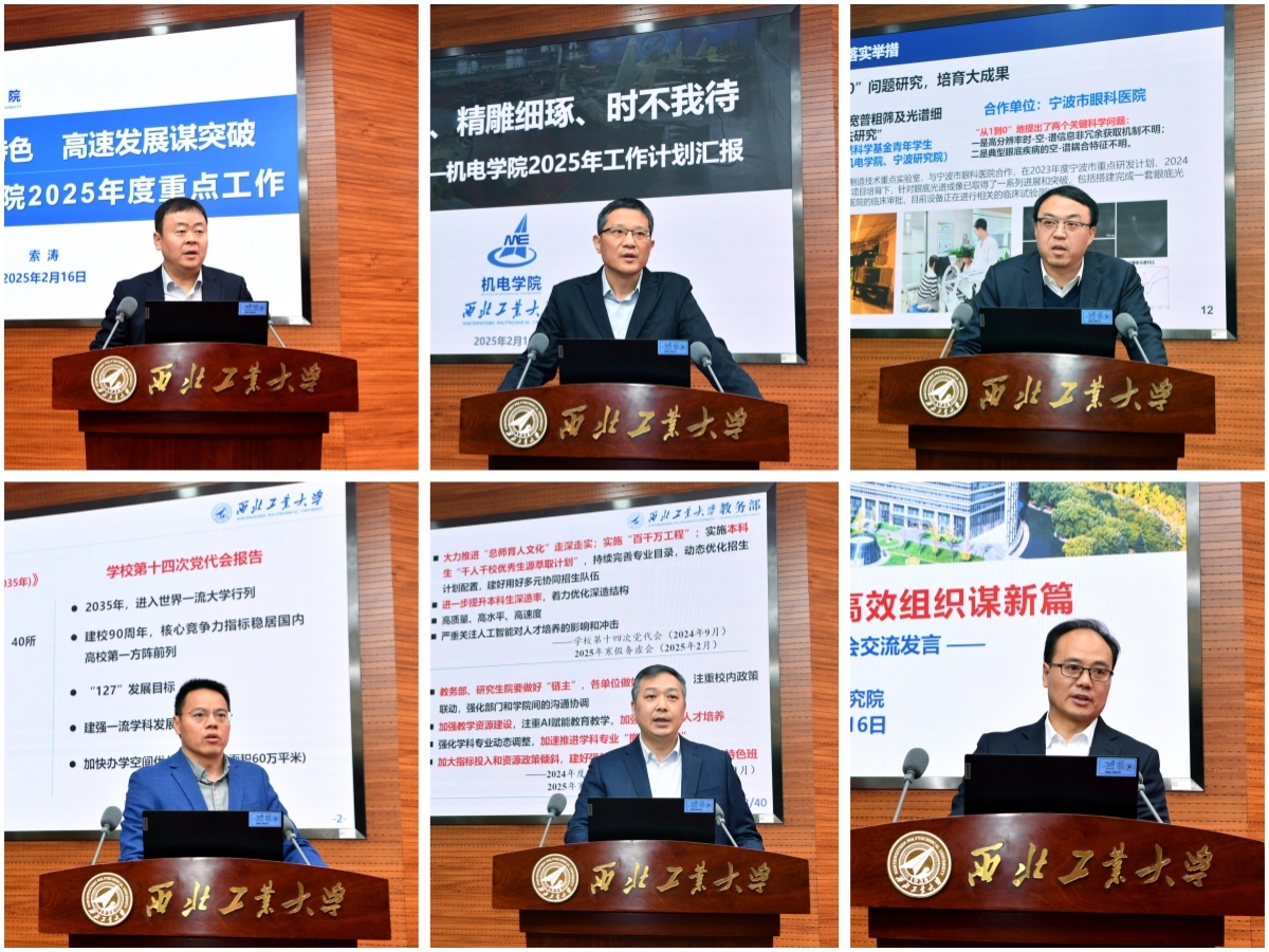 航空学院院长索涛、机电学院院长常洪龙、宁波研究院院长盛其杰、发展规划处处长甘雪涛、教务部部长王海鹏、科学技术研究院院长王伶等六位同志围绕本单位2025年重点工作如何进一步改革创新、提升核心竞争力,讲目标任务、谈工作思路、提落实举措。大家一致表示,将继续以昂扬向上的精神风貌、挺膺担当的奋斗姿态、狠抓落实的信心决心,高质量完成各项工作任务,以实干实绩为“127”近期发展目标和“天下工大、世界三航”远景目标的实现贡献力量。