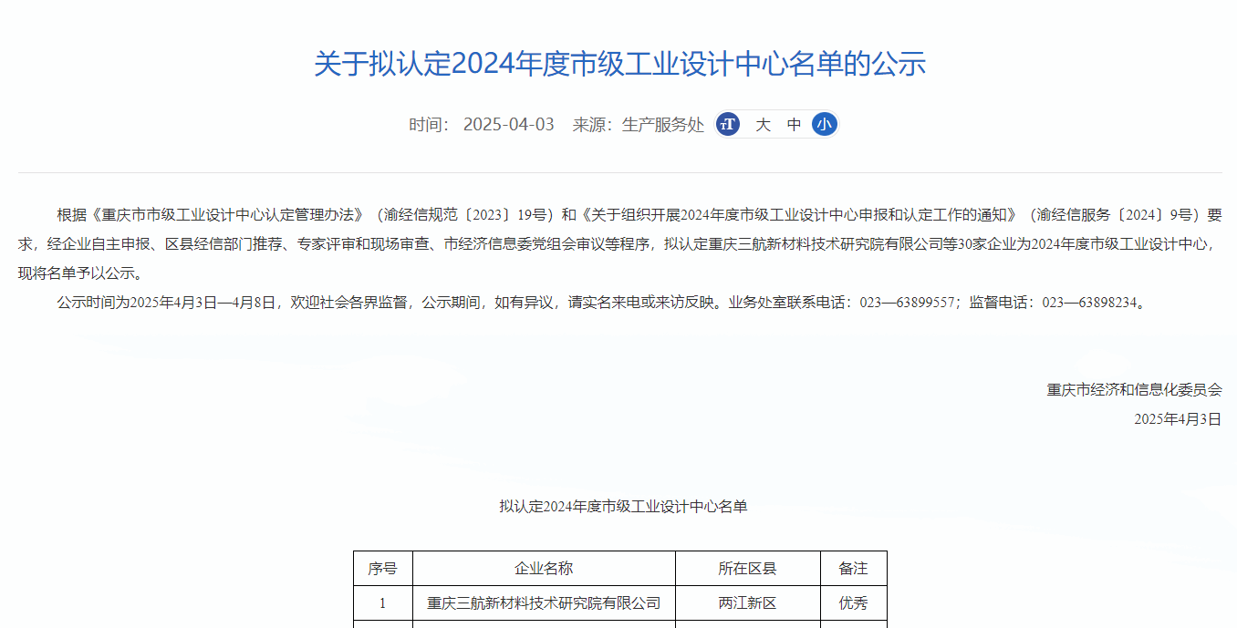 近日,重庆市经济和信息化委员会发布《2024年度市级工业设计中心拟认定名单》,重庆三航新材料技术研究院有限公司(以下简称三航研究院)凭借在新材料领域突出的创新能力和设计成果,成功入选并获评为“优秀级”工业设计中心。